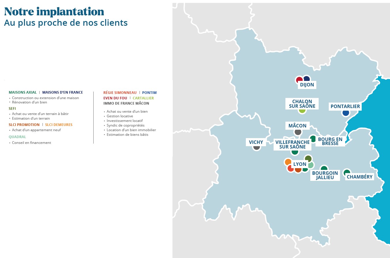 • Administration de biens : 6 cabinets d'administration de biens gèrent les activités de gestion locative et location, de syndic de copropriété et de transaction, avec la Régie Simonneau à Lyon, le Cabinet Cartallier à Chalon sur Saône, Immo de France Mâcon à Mâcon, Pontim à Pontarlier, Lagrue à Vichy et Even du Fou à Dijon.