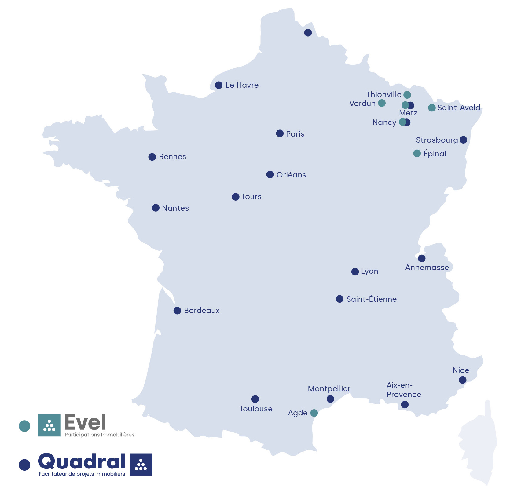 Le groupe est multirégional, avec une présence historique en Lorraine pour le Groupe Evel et une expansion dans les principales métropoles régionales pour le groupe Quadral.